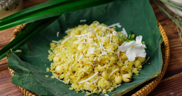 Xôi xéo vàng óng từ gạo nếp dẻo thơm, ăn kèm đậu xanh nghiền mịn, hành phi giòn rụm và chút mỡ gà béo ngậy. Món xôi này vừa no, vừa thơm, thích hợp cho bữa sáng.